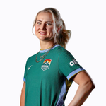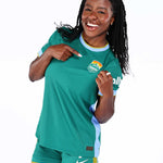 Person wearing a green sports uniform holding a soccer ball on a white background